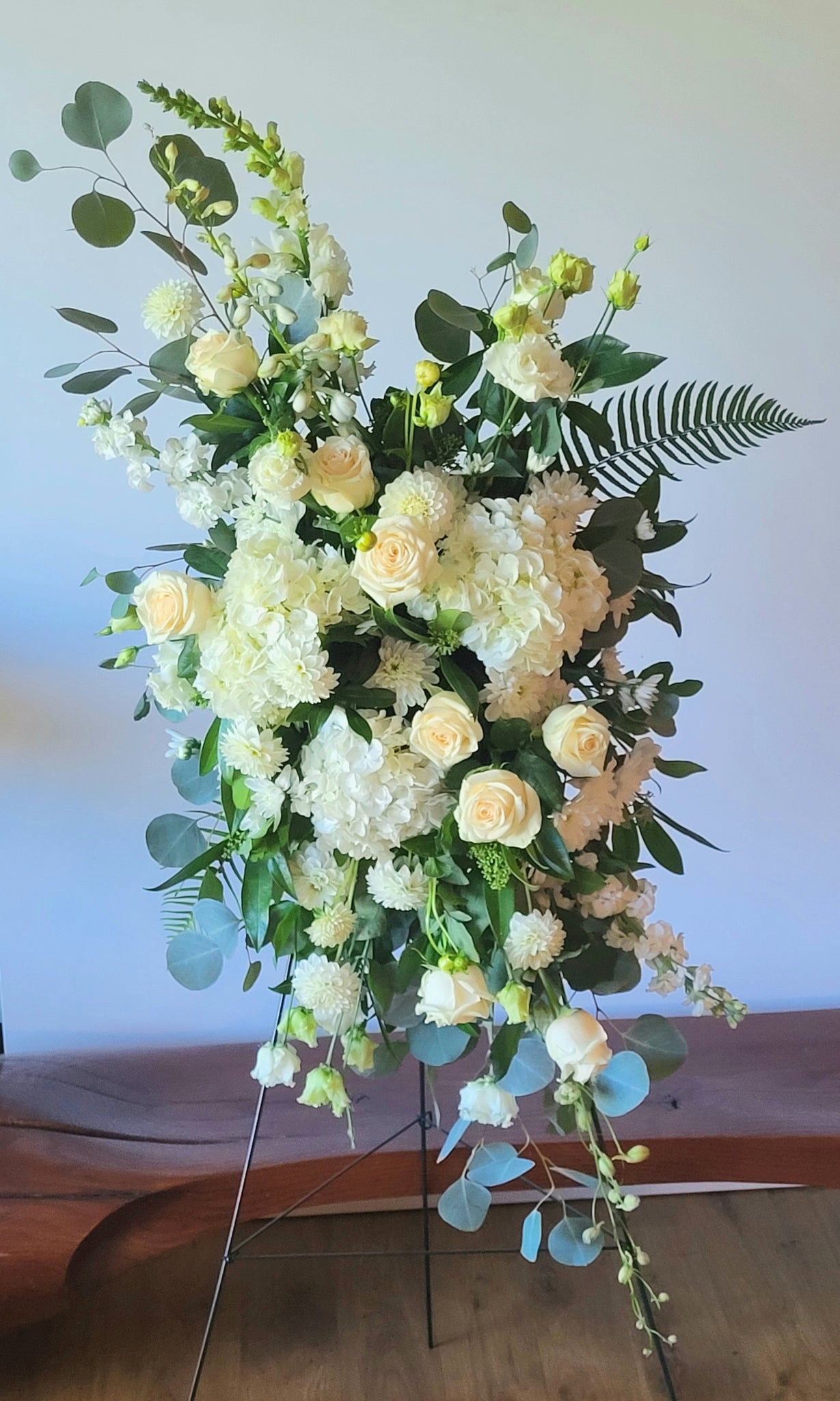 It is best to order this at least one day before delivery. Made for funeral gatherings. Add a unique look with one of our standing sprays. If you would like to add a little something with a standing spray or two, then take a look at our flower arrangements. Please call in your order if you need an engraved ribbon. We would like to make this time as easy for you as possible. Pictures are only examples of work.