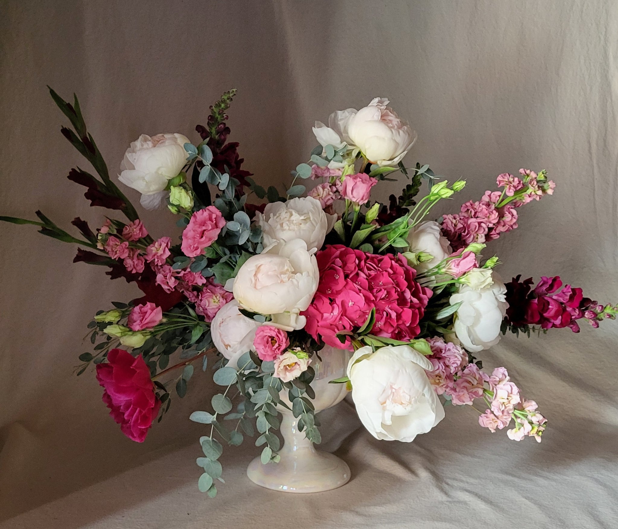 Arranged flowers into creative designs. A centerpiece that takes a longer time to make and focusses on shapes and textures. A ceramic vase is already included. Show her how special she is with what we are most popular for. Photo's are only examples of work. Colors are mainly pink, red and white.